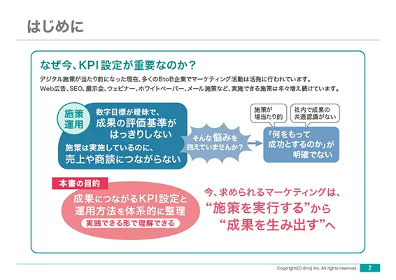 本資料では、KGIから逆算したKPIの設計方法から、施策別の具体的な指標設定、運用・改善のポイントまでを体系的に整理。